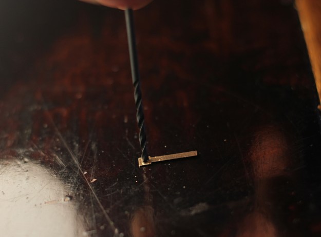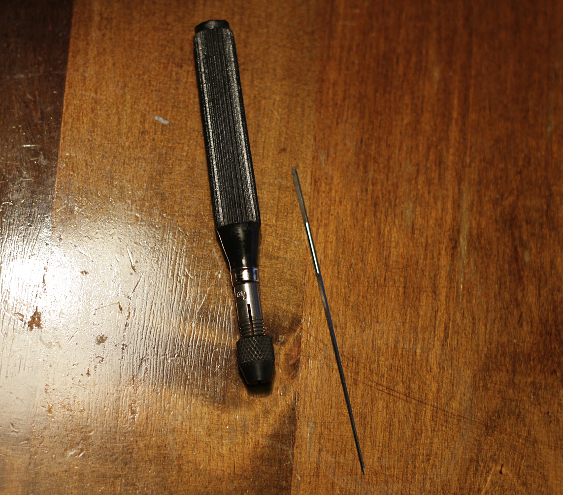Sitten kaiverretaan kierteet juuri suurennettuun reikään käytämällä 1,4mm “tap”-työkalua. Tässä vaiheessa on tärkeää että kaiverrus tapahtuu mahdollisimman tarkasti kohtisuoraan kielilaattaa kohti, jotta kierteet eivät kaiverru vinoon. Muutaman kerran joudut pyörittämään tap-työkalua lujasti, mutta sen jälkeen sen pitäisi pyöriä kierteissä kevyesti ja vastapäivään pyörittäessä sen pitäisi tulla reiästä ulos.
