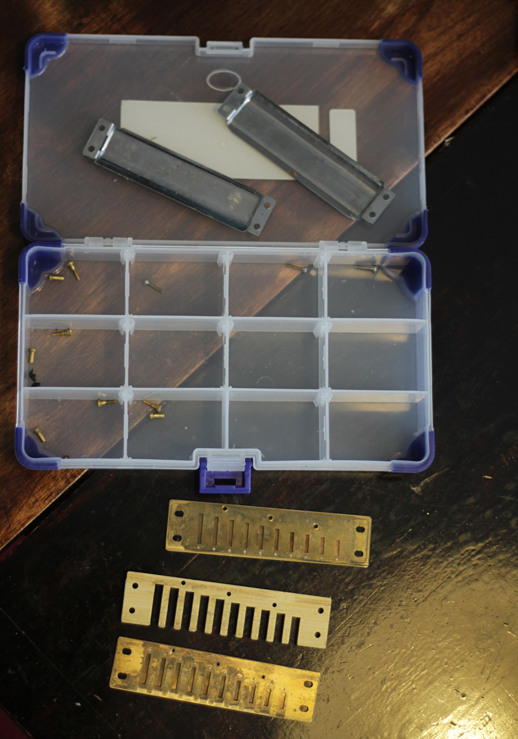 Irrota ensimmäiseksi huuliharpusta kuoret ja kielilaatat. On suositeltavaa käyttää jonkinlaista pientä lokerikkoa jotta ruuvit pysyvät tallessa.
