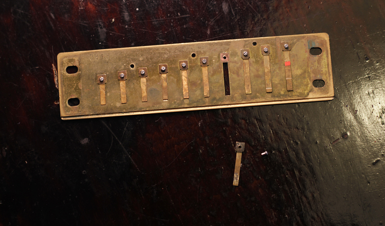 Seuraavaksi ruuvataan vastakappale kiinni ruuviin niin että se kiinnittää kielen kielilaattaan. Ruuvaus kannattaa tehdä niin että pitelet kielilaattaa ylösalaisin ja pitelen sormella kiinni uudesta kielestä että se pysyy suorassa. Kiristä tarpeeksi tiukasti. Hohnerin mukaan ylikiristäminen ei ole mahdollista, joten kiristyksen saa tehdä kunnolla.