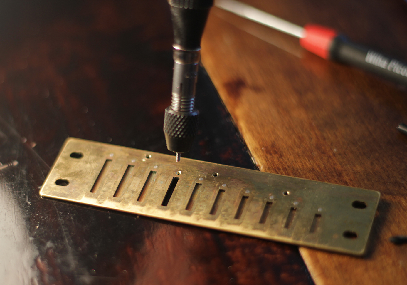 Seuraavaksi hienonnetaan reiän reunat toiselta puolelta kielilaattaa (eli siltä puolelta josta reamer-työkalu ei mennyt sisään vaan tuli ulos) poranterällä (sisältyy Hohnerin kielenvaihto-settiin). Älä paina liian kovaa ettei reiän muoto muutu.